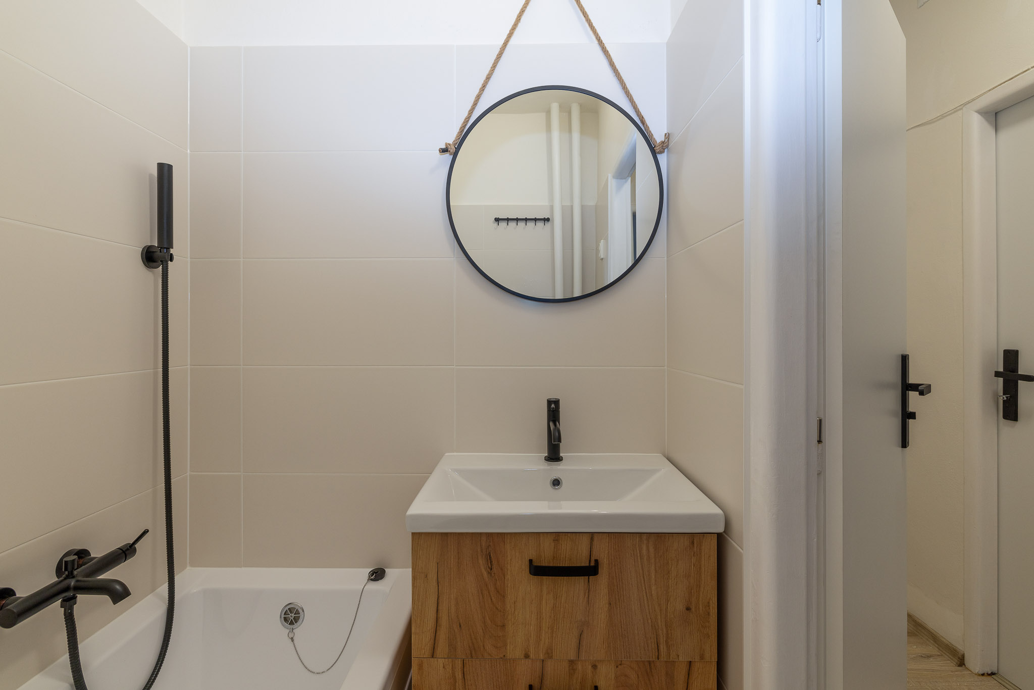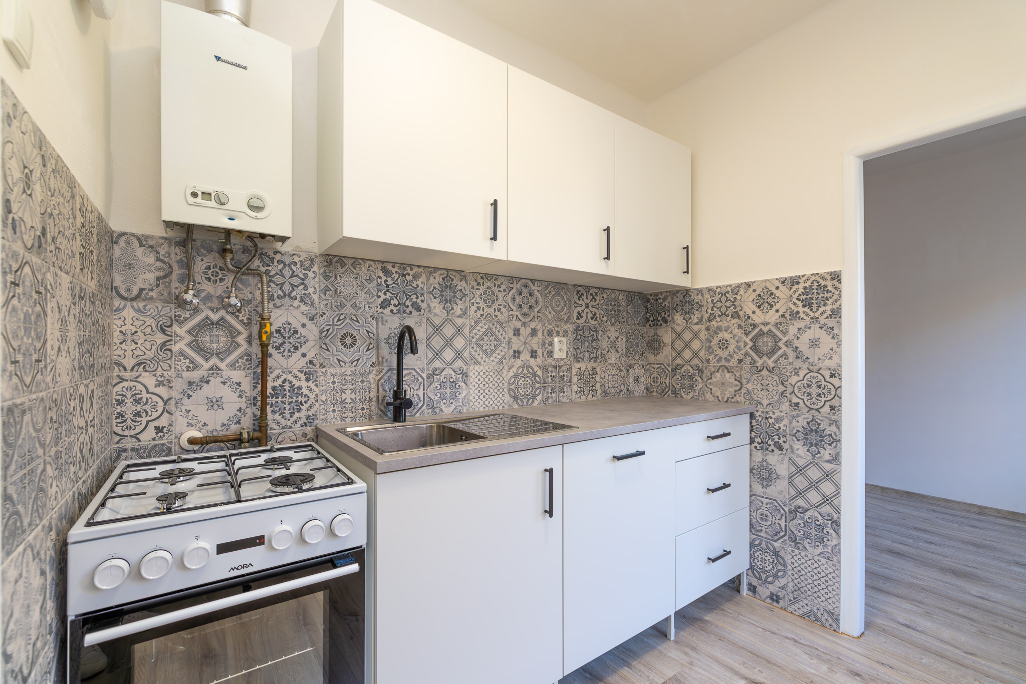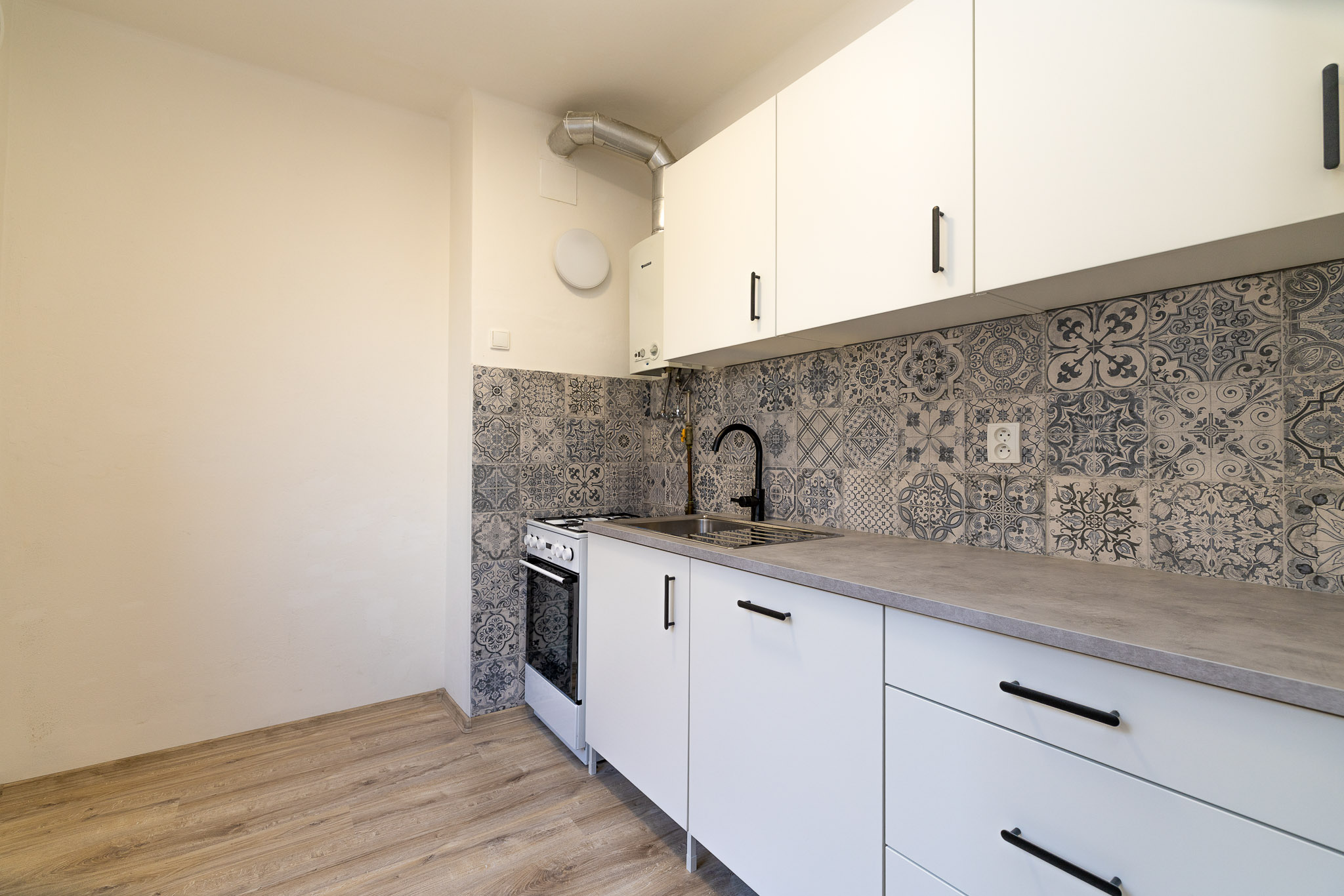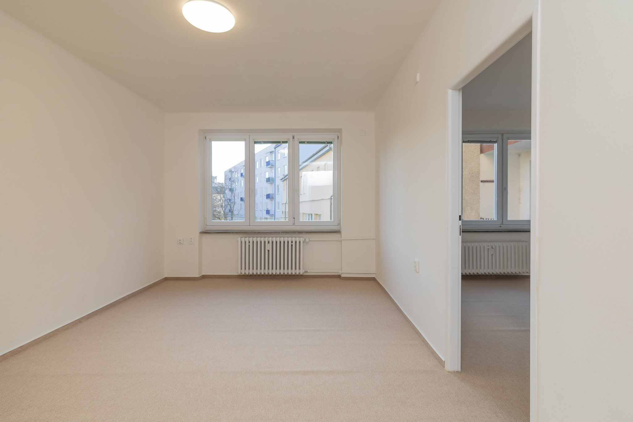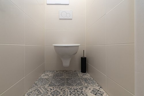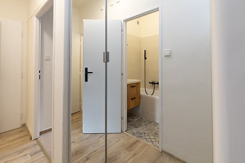 Interiér bytu nabízí komfortní bydlení. Na podlahách v pokojích jsou příjemné koberce, zatímco v kuchyni, na chodbě a v jednom z pokojů najdete praktické plovoucí podlahy. Koupelna a toaleta jsou oddělené, což přispívá k vyššímu komfortu užívání. Obě místnosti mají na podlaze dlažbu a v koupelně je připravena přípojka pro pračku. Srdcem bytu je nová kuchyňská linka, která je již vybavena vestavěnou myčkou a kombinovaným sporákem. Po dohodě s majitelem je možné byt částečně dovybavit dalšími spotřebiči, jako je lednice či mikrovlnná trouba.